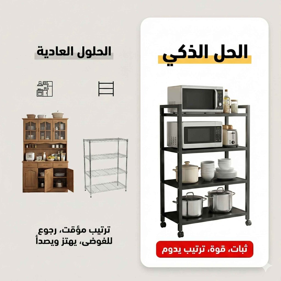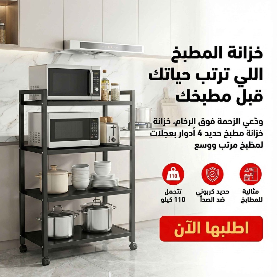 ودّعي الزحمة فوق الرخام، خزانة مطبخ حديد 4 أدوار بعجلات، تشيل الميكروويف والأجهزة الثقيلة وتخلي مطبخك مرتب ووسع.