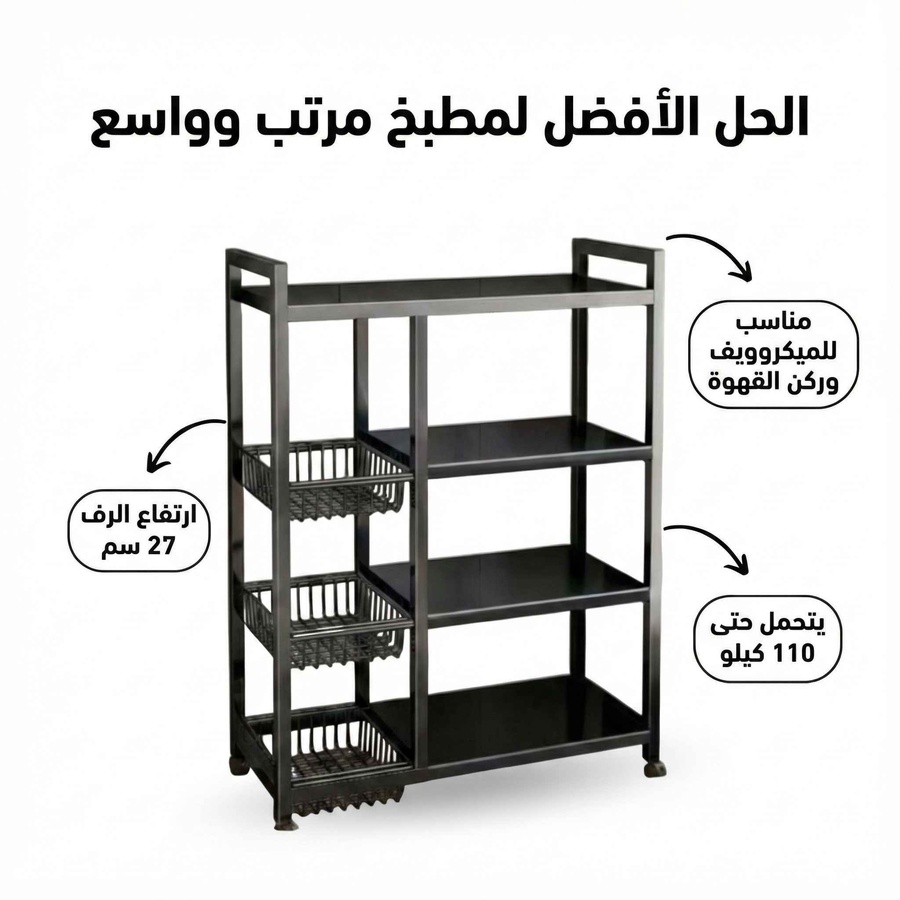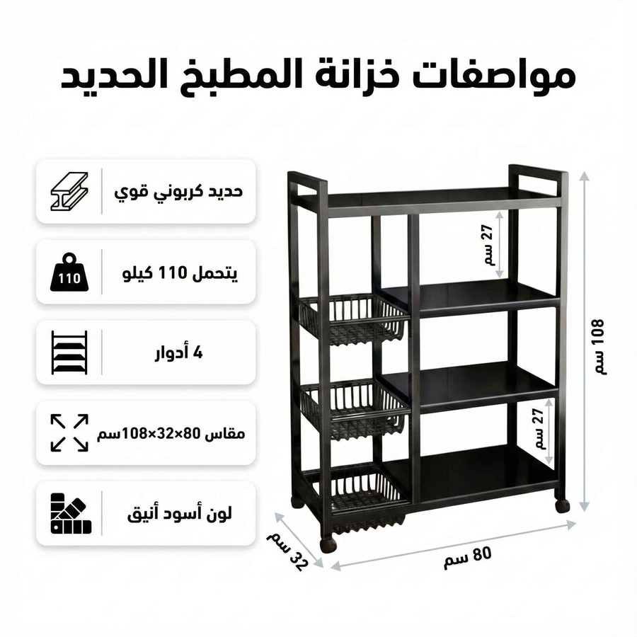 خزانة مطبخ حديد 4 أدوار بعجلات قوية… رف واحد يجمع جهازك الثقيل وأغراضك في مكان مرتب، ثابت، وسهل تحريكه وتنظيف تحته.