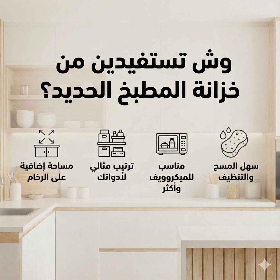 ارتفاع الرف 27 سم، يعني الميكروويف، التوستر، القدور والصحون، وحتى ركن القهوة… كلهم لهم مكان ثابت ومرتب على خزانة وحدة.
